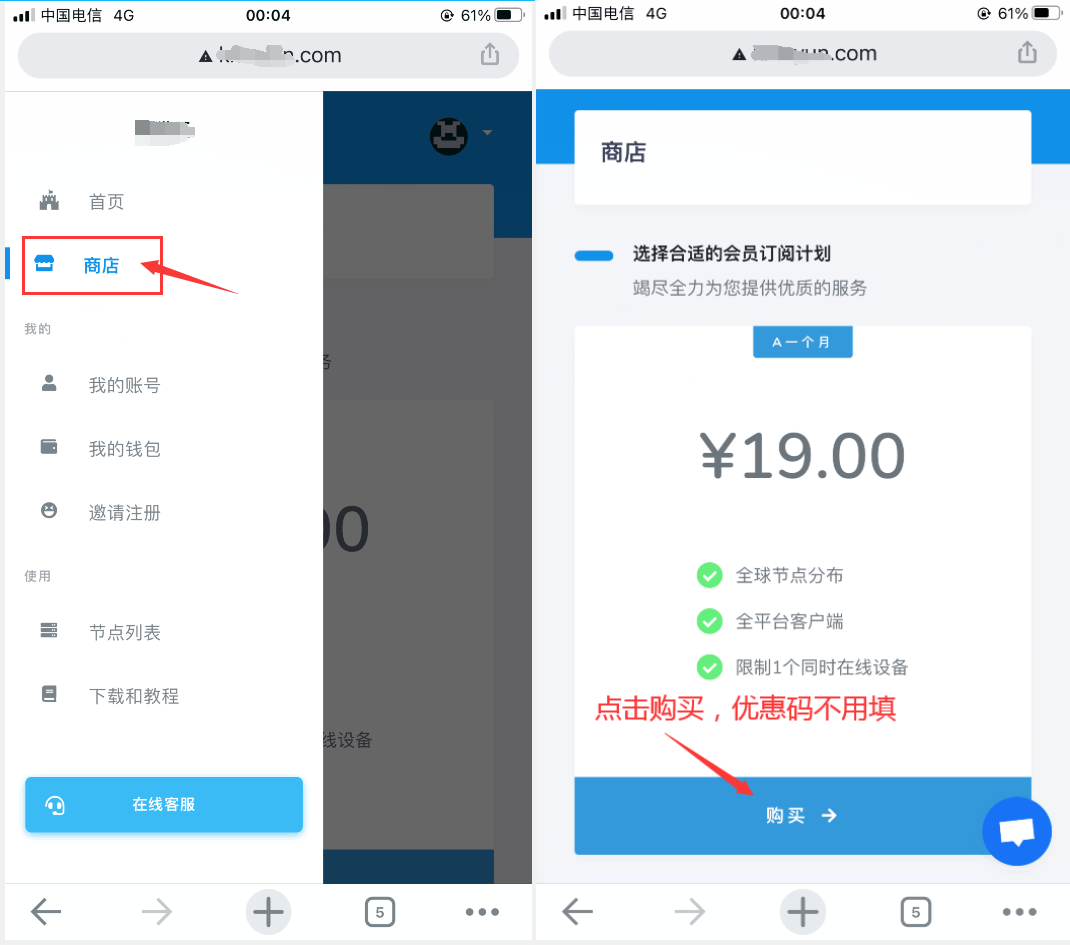 第二步:到我们的网站注册一个账户,先在我的钱包充值,然后再到商店兑换套餐