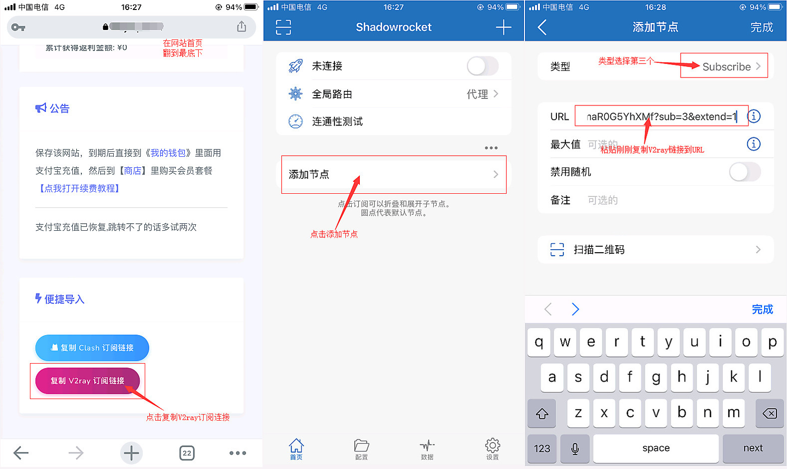 第三步:在官网首页复制V2ray订阅链接,添加订阅链接到小火箭软件URL里面